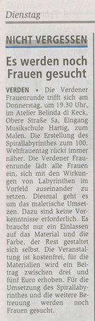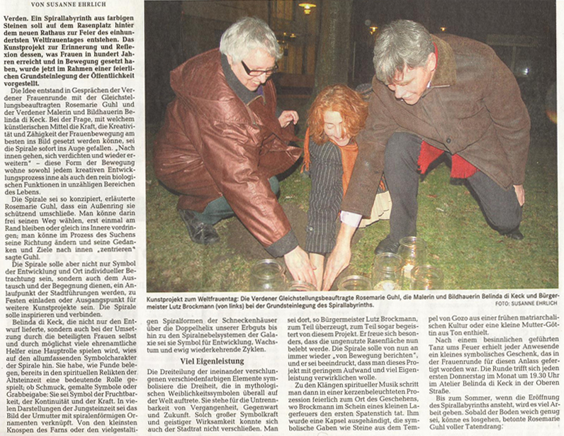 Rosemarie Guhl (Gleichstellungsbeauftragte der Stadt Verden) , hatte die Idee am 100. Weltfrauentag 2011 etwas Besonderes und Bleibendes zu gestalten und ich trage schon lange die begehbare Spirale im Herzen bzw. habe ich auf La Palma in meinem Garten schon damit begonnen, doch durch den Umzug nach Deutschland blieb sie unvollendet.