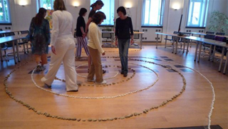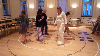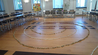 Beim Frauenstammtisch am 13. August stellten wir die Idee vor und sie wurde positiv aufgenommen. Rose und ich legten im Ratsaal im Rathaus Verden eine 2erSpirale. Einen Spiralweg legten wir mit weissen Steinen und den anderen mit unterschiedlich großen braunen und beigen Steinen. Es war sehr beeindruckend, welche Wirkung die Spirale trotz des unruhigen Rathausfußbodens hatte.